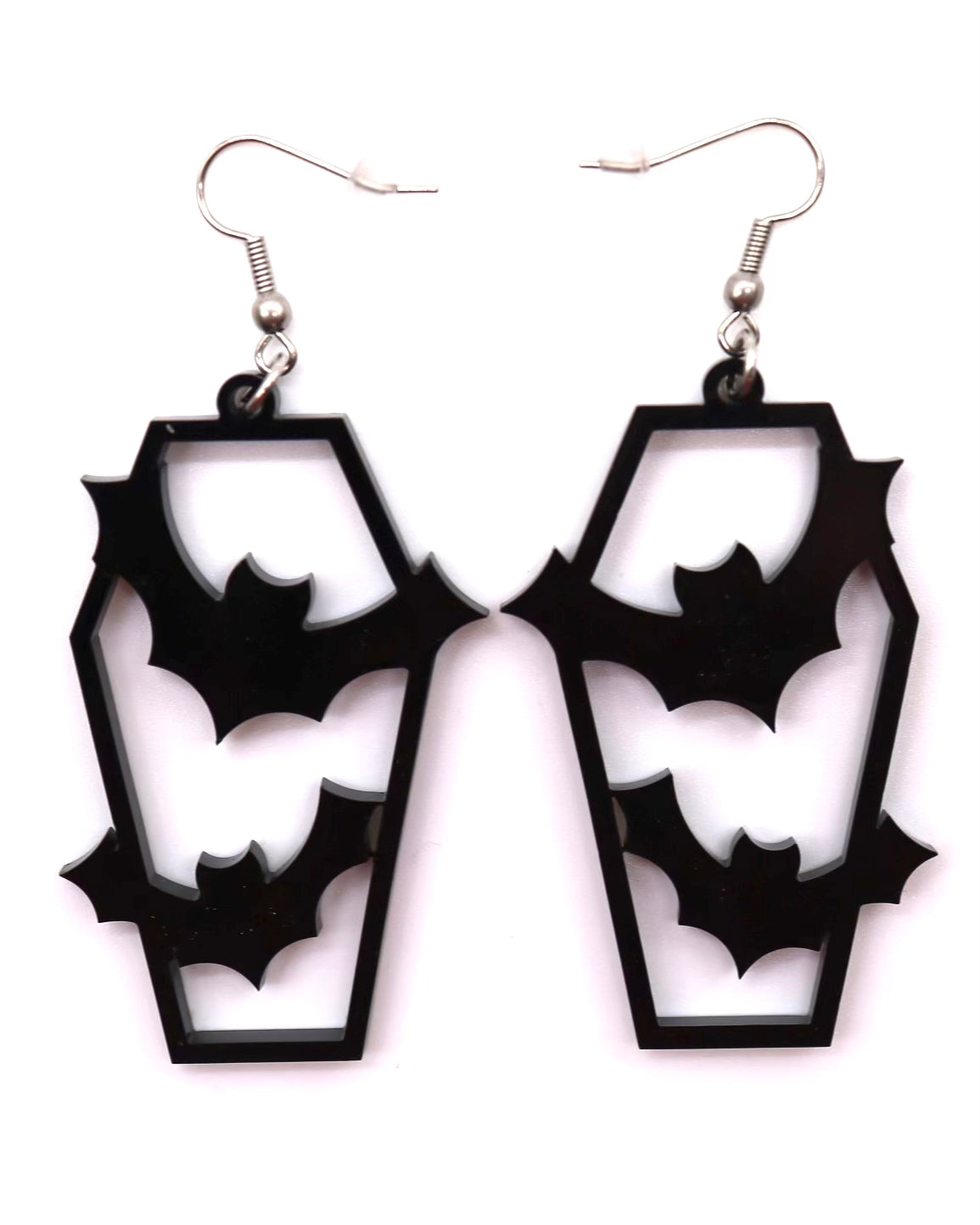 It's time to embrace the dark and dance in the moonlight! Unleash your inner nocturnal spirit with our Coffin Bat Earrings. Featuring a coffin silhouette with edgy bat cutouts. Perfect for those who love a little gothic charm intertwined with their beats, these earrings are bound to make hearts flutter.